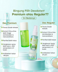 - Varian Premium dengan kemasan yang lebih elegan dan premium serta tambhan kandungan Extra Linmenya yang bikin tambah segerrr dan lebih cepat mencerahkan kulit ketiak. Dan kelebihannya lagi spraynya lebih menyebar seperti spray parfum2 branded jadi akan lebih hemat lagi pemakaiannya.