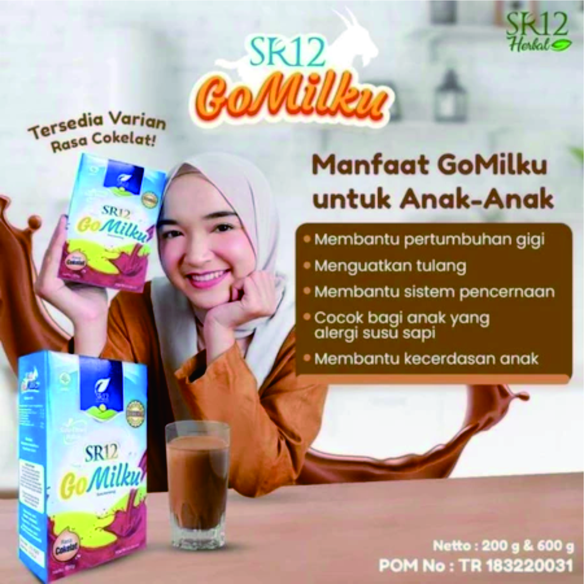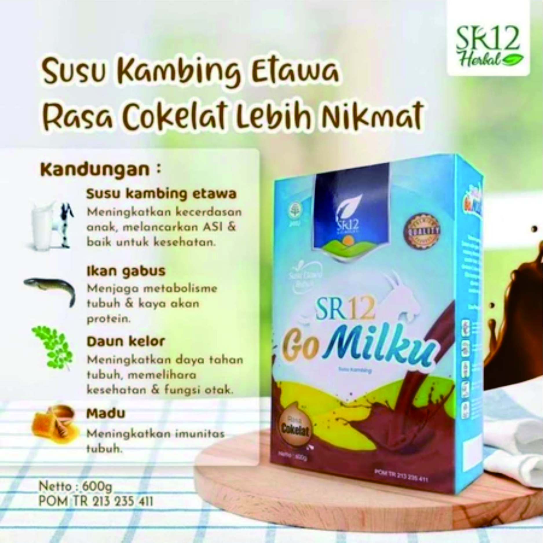 GoMilku SR12 adalah susu kambing etawa bubuk berkualitas premium yang dikombinasikan dengan bahan alami seperti susu kambing etawa, daun kelor, ikan gabus, dan madu. Produk ini bermanfaat meningkatkan kesehatan tulang, imun, lambung, serta aman dikonsumsi anak (1 tahun+) hingga lansia. Tersedia kemasan 200gr dan 600gr dengan varian rasa original, cokelat dan strawberry. SUSU KELUARGA (Bisa Dikonsumsi ANAK, DEWASA DAN MANULA)